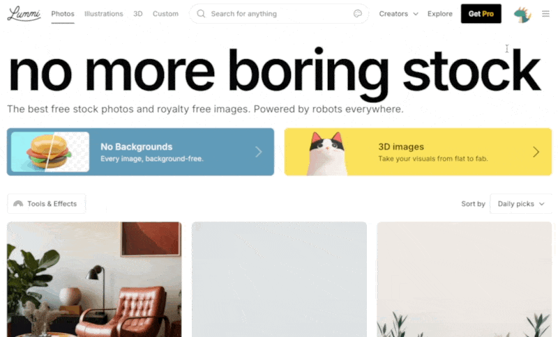Navigate through our pillars—**Photos**, **Illustrations**, and **3D**—to explore our library. Use the search bar to find specific visuals and refine your results with powerful filters: