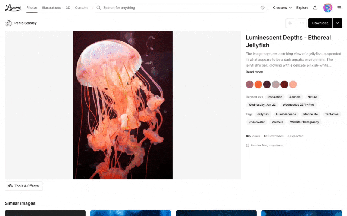 If a image catches your eye, you can discover similar images by selecting the image and scrolling down to **Similar images**. You can view similar by **Subject** or by **Vibes**.&#x20;